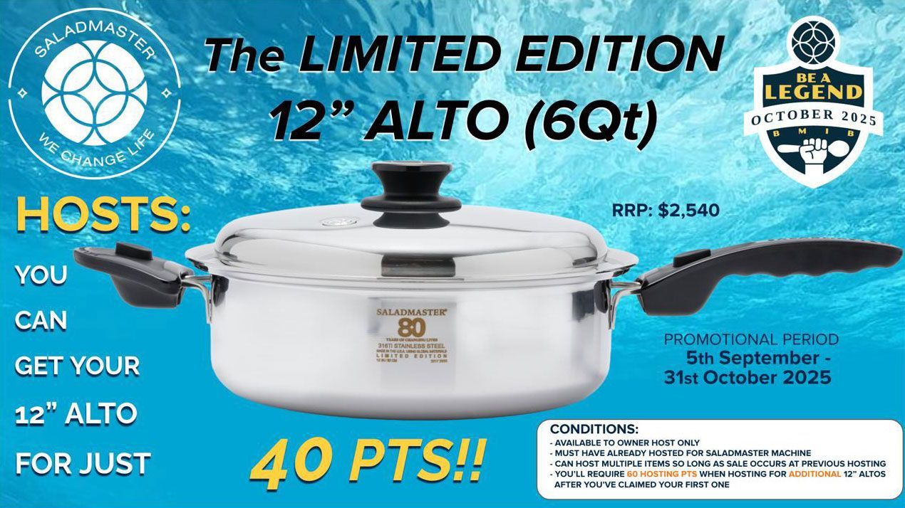 👉 When you host a Saladmaster Cooking Show this October, you’ll unlock access to our Limited Edition 12" Alto, valued at $2540 for only 40 hosting Points!!